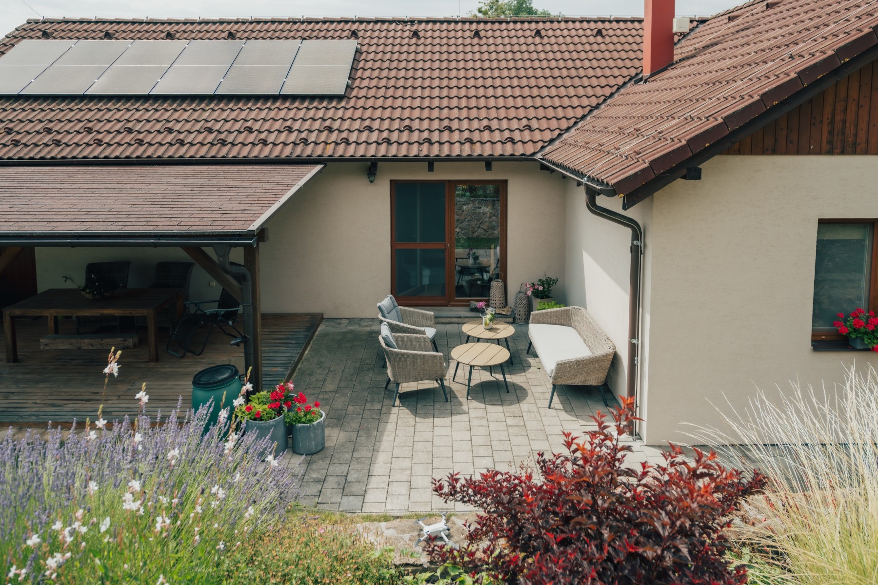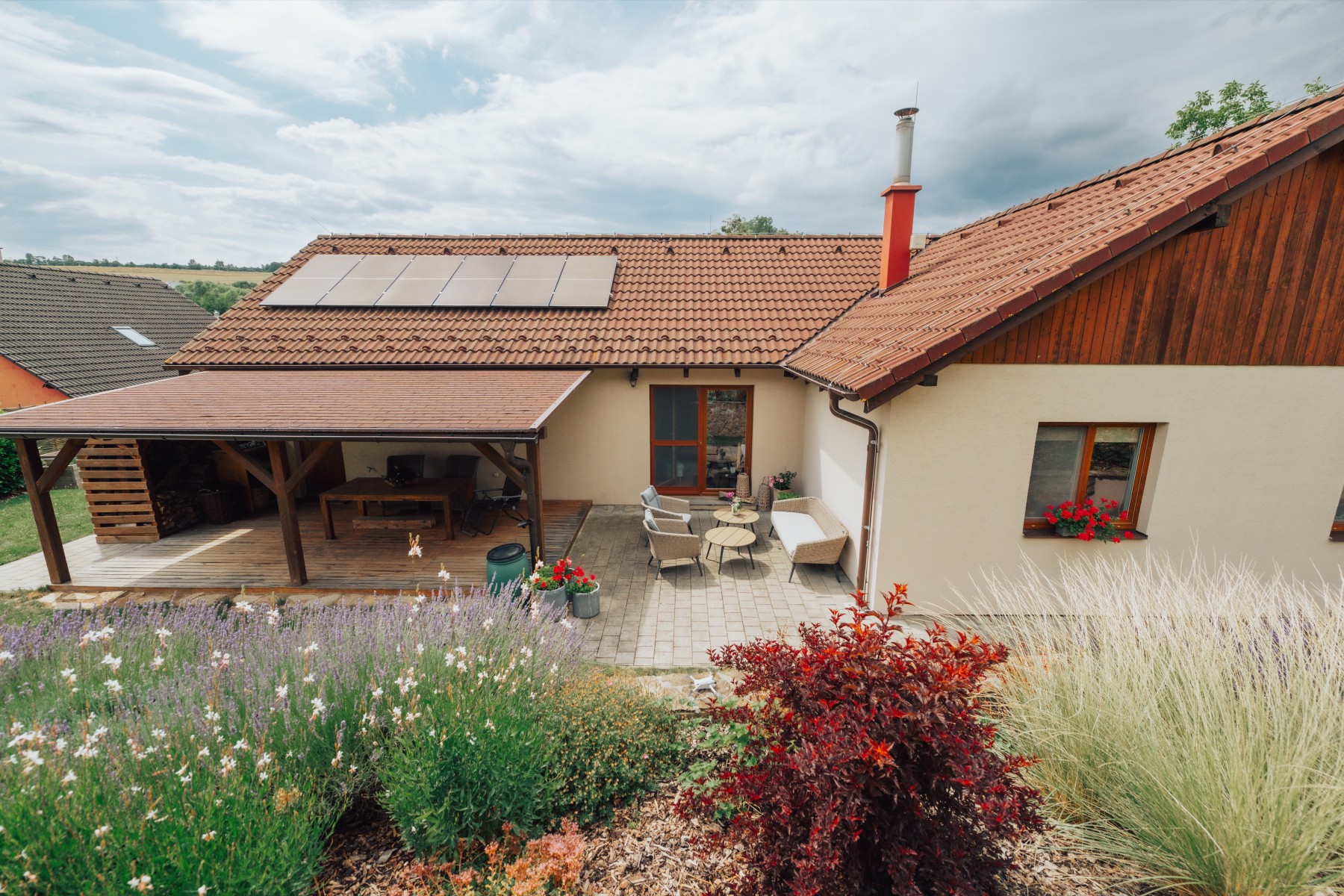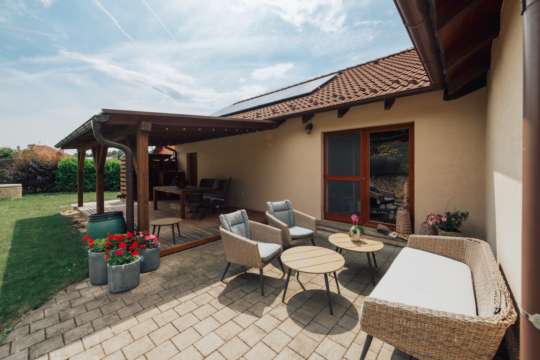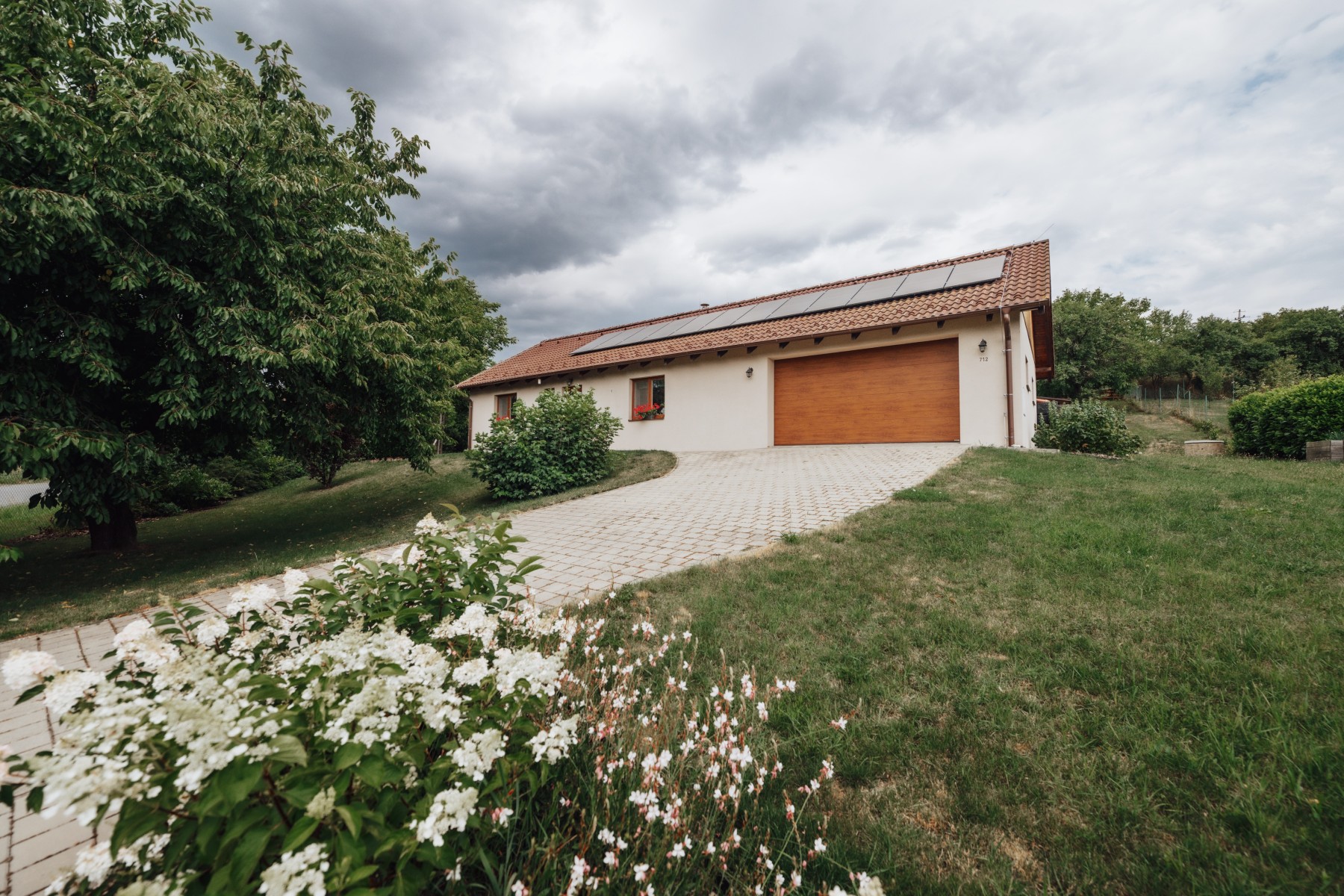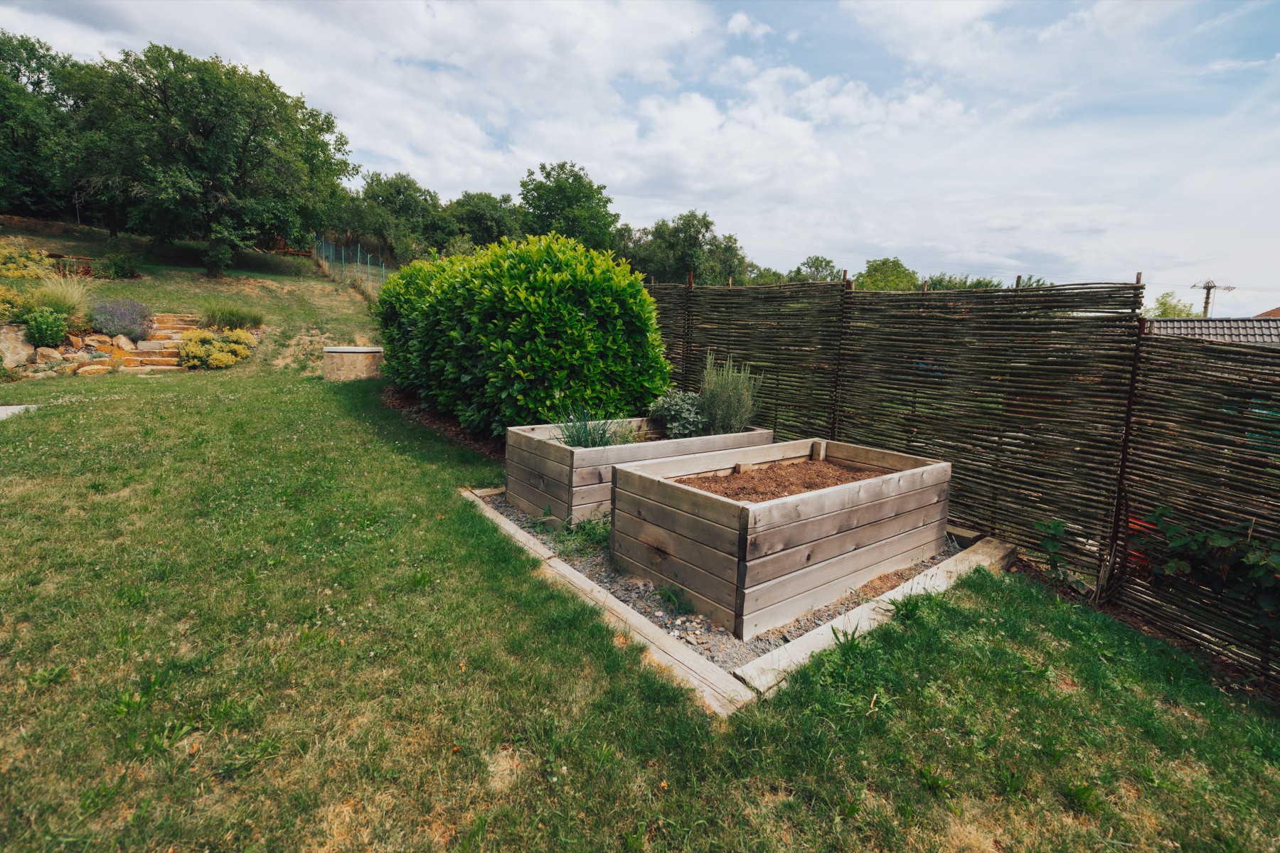 Pečlivě udržovaná zahrada s kvetoucími záhony, ovocnými stromy, keři a vyvýšenými záhony poskytuje naprostý klid a soukromí. Vše je navrženo s důrazem na funkčnost a estetiku.